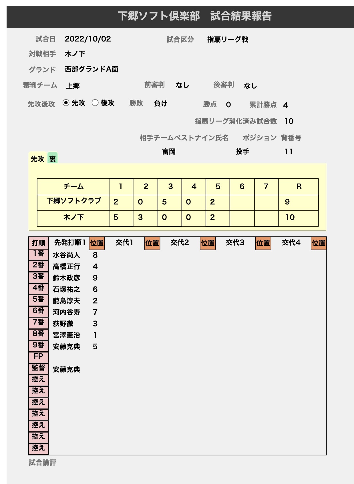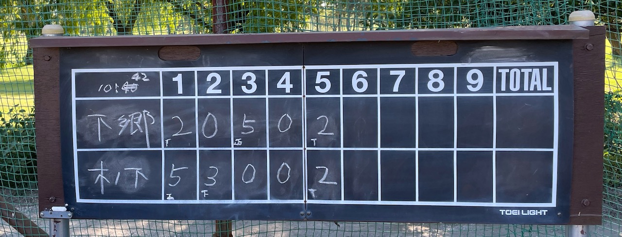 後半戦連敗スタート 9月25日対新屋敷戦、10月2日対木下戦は連敗スタート。新屋敷戦では、初対戦のピッチャー相手に打てず。久々の4番も口だけしか出なかった。メンバーが大幅に変わった木下、前週では31得点の相手には、打ち負け。レギュラー4名が60代のチーム、残り2戦だ。